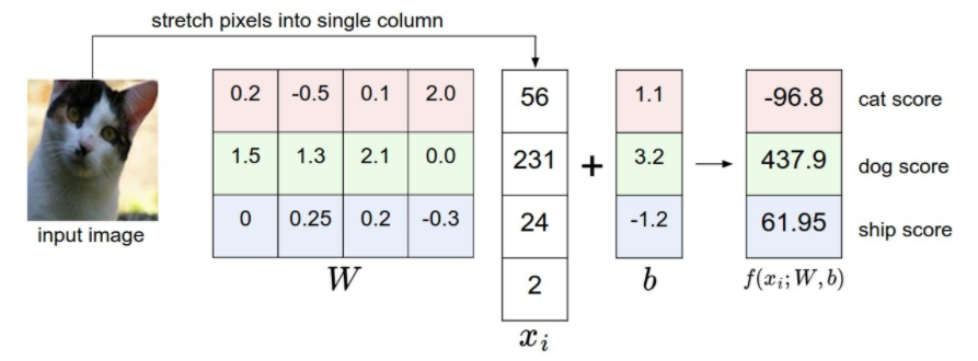 $$ f(x_{i}, W, b) = Wx_{i} + b$$
