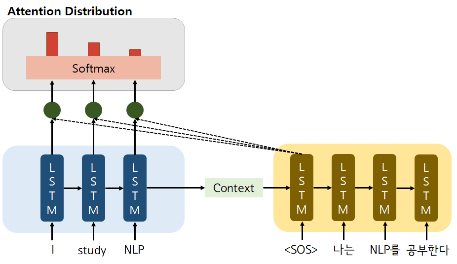 위의 그림에서 decoder는 현재 시점을 <SOS> 토큰 위치인 첫번째 시점 (t=1)으로 예를 들고 있기 때문에