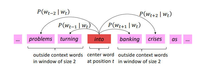 word2vec은 위 그림과 같이 into라는 단어를 중심으로 주변 단어들이 등장하는 확률을 계산하여 into 주변에 등장할 단어를 학습한다.