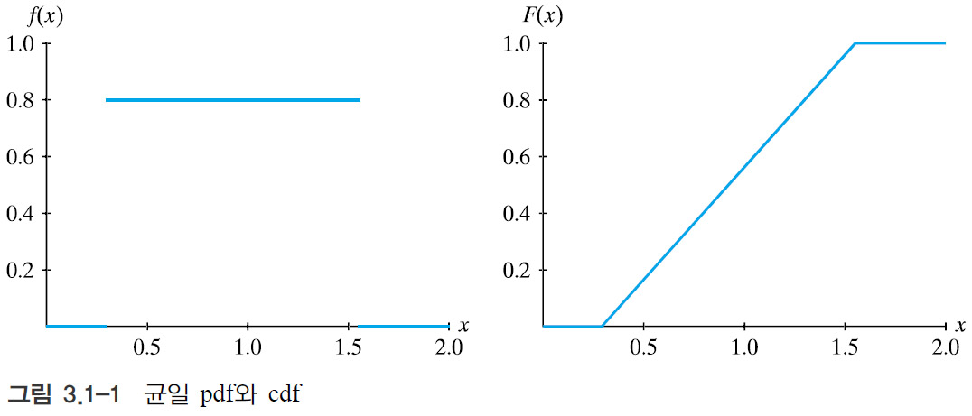 cdf의 도함수 $F'(x) = f(x)$는 $f(x) = \frac{1}{b-a}, a \leq x \leq b$와 같은 균일분포(uniform distribution)의 형태를 나타낸다.