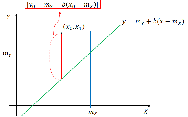 $S$ 위의 임의의 점 $(x_{0}, y_{0})$으로부터 $(m_{X}, m_{Y})$를 통과하는 직선 $y = m_{Y} + b(x - m_{X})$까지의 수직거리는 $|y_{0} - m_{Y} - b(x_{0} - m_{X})|$ 와 같다.